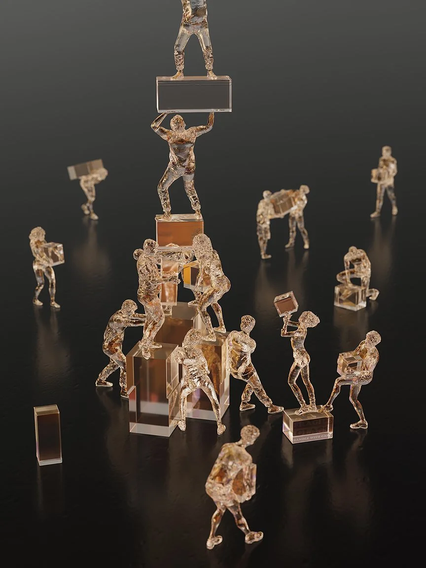 The Glass Menagerie is a 3D animation video artwork that muses on the notion of "humanity on display" in a world that is increasingly polarized and fractured. The virtual (simulated) representation of glass takes on the uncanny and serves as further estrangement from the physicality of existence where glass connotes reflection, refraction, filtration, and mediation of outside worlds, especially with the proliferation of ubiquitous screens. Rather than a typical collection of animals, this menagerie exhibits the captivity of human creatures, both at home and at odds with their environment, inhabitants, consumers and products of their own desires and imaginative constructs.